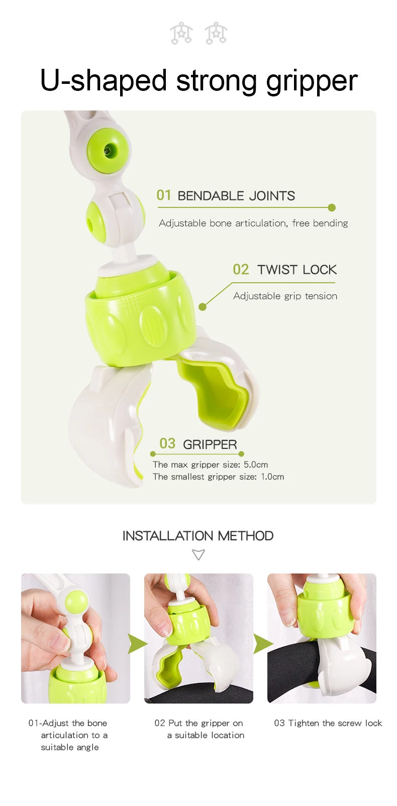 ❤️Clamping Range: 2-8 cm / 0.8-3.5". The hanging angle of the Bassinet toy can be easily adjusted to fit the toy within baby's field of vision. It folds easily into any shape and will not accidentally hurt baby due to the drop. Please measure your pram play, stroller, crib, car seat before order, check if our arch mobile can fit or not.